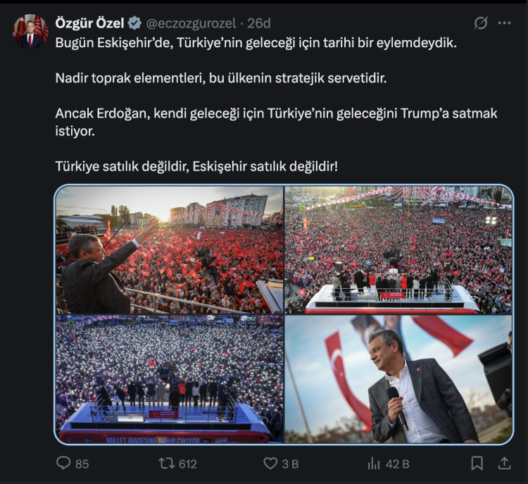 ''Dünyada beşinci en büyük rezerv Türkiye'de, Eskişehir'de. Büyük bir oyunla karşı karşıyayız. Erdoğan, Trump'a 'nadir toprak elementleri'ni ham cevher olarak vermeyi taahhüt ediyor. Eğer bunu verirsek, altın yumurtlayan tavuğu vermiş oluruz. Eğer bunu verirsek, geleceği vermiş oluruz. Nadir elementler bu ülkenin geleceğidir, sana sattırmayız!''