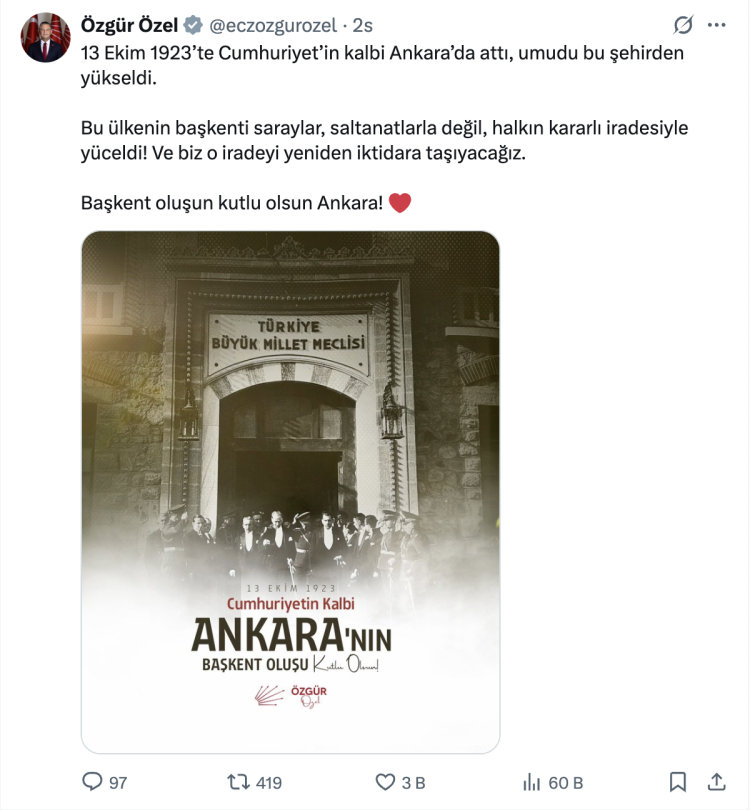 "13 Ekim 1923’te Cumhuriyet’in kalbi Ankara’da attı, umudu bu şehirden yükseldi. Bu ülkenin başkenti saraylar, saltanatlarla değil, halkın kararlı iradesiyle yüceldi. Ve biz o iradeyi yeniden iktidara taşıyacağız. Başkent oluşun kutlu olsun Ankara."