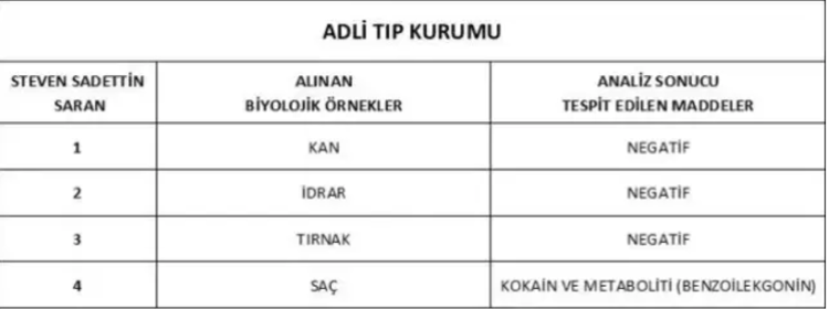 İstanbul Cumhuriyet Başsavcılığı’nca yürütülen soruşturma kapsamında Adli Tıp Kurumu tarafından hazırlanan raporda, Sadettin Saran’ın yalnızca saç örneğinde uyuşturucu testinin pozitif çıktığı belirtildi. Raporda; kan, idrar ve tırnak örneklerinde ise herhangi bir uyuşturucu maddeye rastlanmadığı ifade edildi.