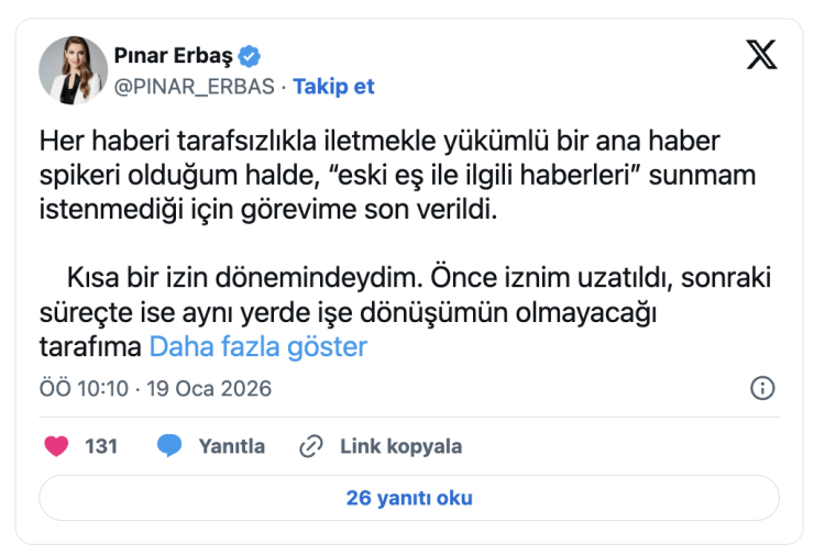 Erbaş, sosyal medya hesabından yaptığı açıklamada, "'Eski eş ile ilgili haberleri' sunmam istenmediği için görevime son verildi" ifadelerini kullandı.