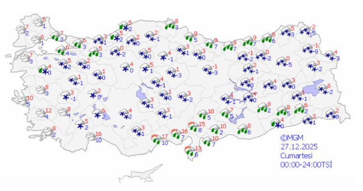 "Meteoroloji Genel Müdürlüğü’nün yaptığı son değerlendirmelere göre, İstanbul genelinde 26 Aralık Cuma gününden itibaren hava sıcaklıklarının 5 ila 8 derece azalması ve mevsim normallerinin altına düşmesiyle, soğuk ve yağışlı havanın önümüzdeki hafta boyunca etkisini sürdüreceği tahmin edilmektedir. İstanbul’da 26 Aralık 2025 Cuma ve 27 Aralık 2025 Cumartesi günleri için beklenen yağışların genellikle yağmur şeklinde olacağı tahmin edilmektedir. İstanbul’un kuzey kesimleri ile yükseklerinde yer yer karla karışık yağmur ve kar yağışı ihtimali bulunmaktadır. İstanbul’da özellikle gece ve sabah saatlerinde görülebilecek buzlanma ve don hadiseleri hususunda dikkatli ve tedbirli olunmalıdır."