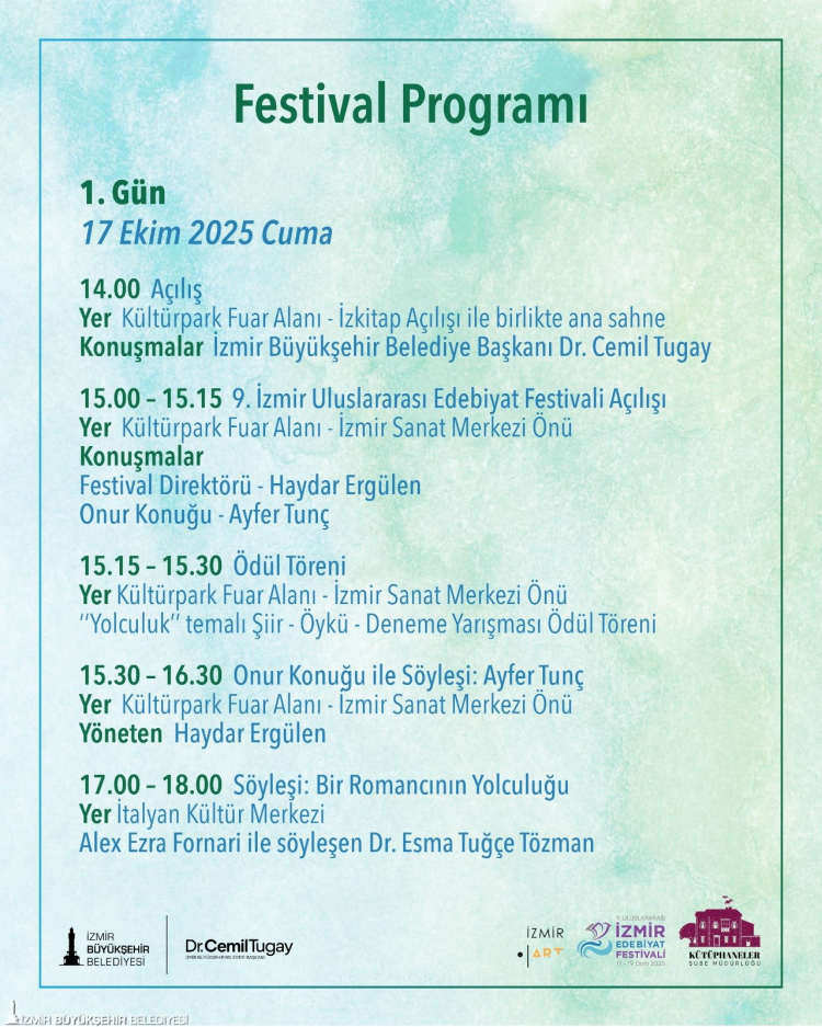 Festivalin açılışı, 17 Ekim’de İZKİTAPFEST – 6. İzmir Kitap Fuarı ile eş zamanlı olarak Kültürpark’ta yapılacak. Açılış gününde ayrıca lise öğrencileri arasında düzenlenen “Yolculuk” temalı şiir, öykü ve deneme yarışmasının ödül töreni gerçekleştirilecek.