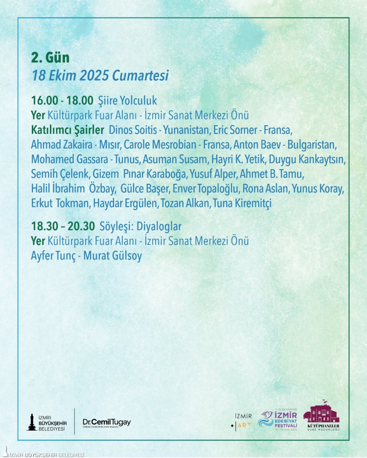 İzmir Büyükşehir Belediyesi tarafından bu yıl dokuzuncusu düzenlenecek İzmir Uluslararası Edebiyat Festivali, 17-19 Ekim tarihleri arasında Türkiye’den ve dünyadan yazar ve şairleri bir araya getirecek.
