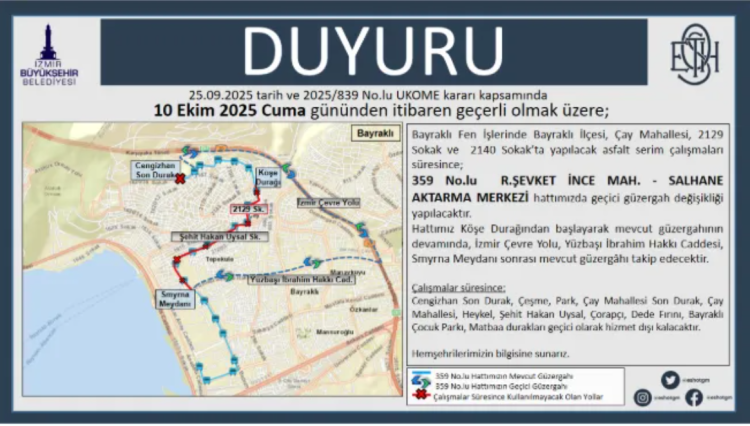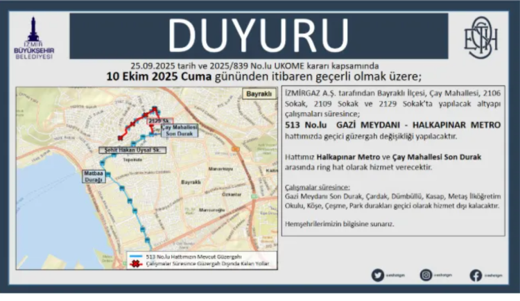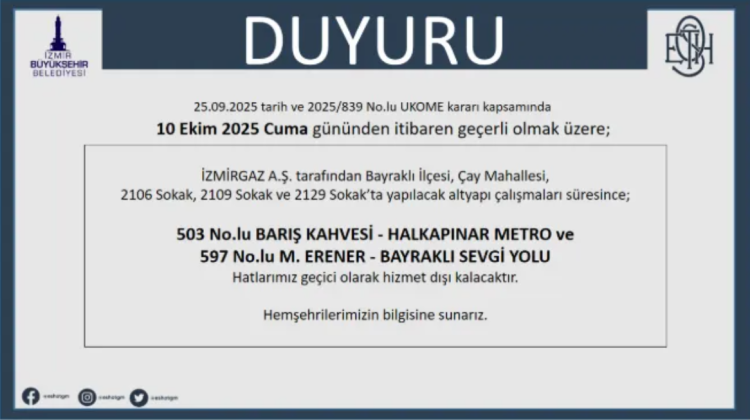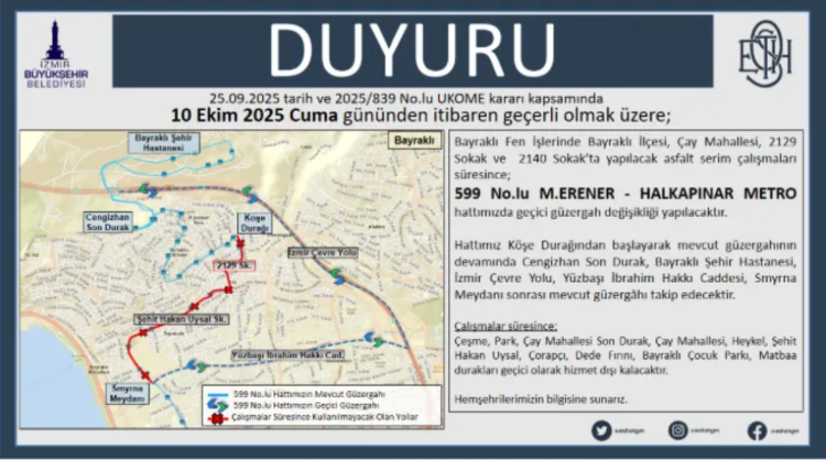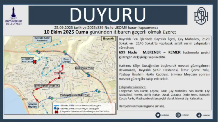 ESHOT Genel Müdürlüğü, çalışmalar süresince vatandaşların alternatif güzergahları kullanmaları gerektiğini hatırlattı. Uygulamanın süresine dair açıklama yapılmadı.