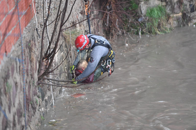 İzmir Büyükşehir Belediyesi İtfaiye ekipleri, dere ortasında mahsur kalan vatandaşı kurtarmak için özel halat ve can güvenliği donanımıyla müdahalede bulundu. Uzun süren titiz çalışmanın ardından C.Ç., mahsur kaldığı noktadan güvenli alana çıkarıldı.