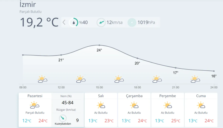 13 Ekim Pazartesi günü sabah saatlerinde hava sıcaklığı13 derece olarak ölçülürken, gün içinde 24 dereceye kadar yükselmesi bekleniyor. Meteoroloji verilerine göre, İzmir genelinde ani bir hava değişikliği beklenmezken, akşam saatlerinde sıcaklık 12 dereceye kadar düşecek. Hissedilen sıcaklık, gün boyunca gerçek değerlerle paralel seyredecek.