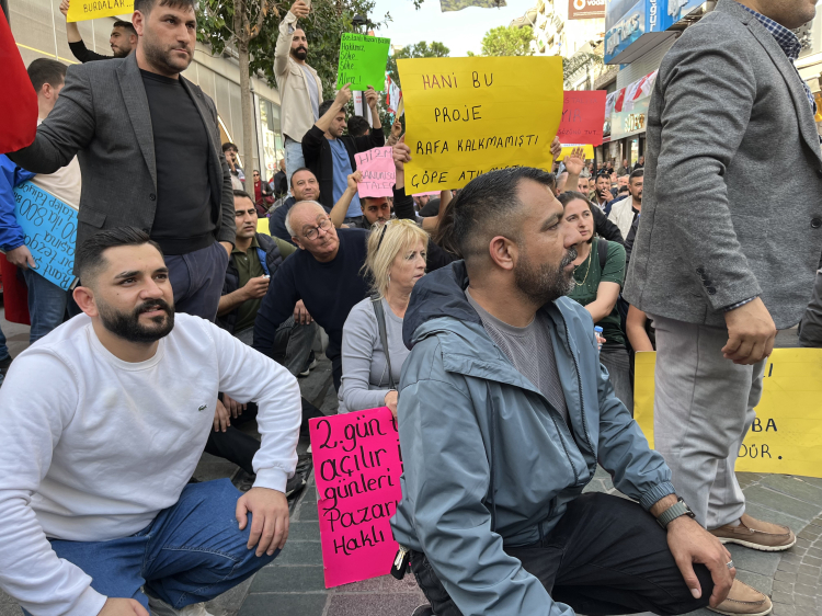 Karşıyaka Belediyesi önünde sabah saatlerinde toplanan pazarcılar, “Başkan istifa” sloganlarıyla tepkilerini dile getirdi. Belediye Başkanı Yıldız Ünsal ile görüşme taleplerine yanıt alamayan grup, Karşıyaka Çarşısı’na yürüyerek CHP Karşıyaka İlçe Başkanlığı önünde oturma eylemine geçti.