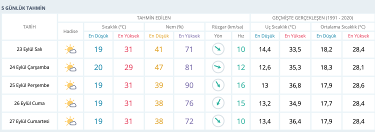 23-27 Eylül tarihleri arasında İzmir'de en yüksek sıcaklık 29-31 derece arasında değişirken, nem oranı da yüzde 38 ile 90 arasında seyredecek. Meteoroloji raporuna göre 23 Eylül Salı günü kentte hava az bulutlu ve güneşli olacak. En düşük sıcaklık 19, en yüksek sıcaklık ise 31 derece olarak öngörülüyor. Nem oranı gün içinde yüzde 41 ile 71 arasında değişecek. Çarşamba günü ise sıcaklık 29 dereceye düşerken nem oranı yüzde 47 ile 81 seviyelerine kadar çıkacak. Haftanın ikinci yarısında ise yeniden 31 derecelik sıcaklıklar görülmesi bekleniyor. Perşembe, cuma ve cumartesi günleri kentte en düşük sıcaklık 19, en yüksek sıcaklık 31 derece olacak. Ancak perşembe günü nem oranının yüzde 90’a kadar çıkması bekleniyor ki bu da hissedilen sıcaklığı artıracak.