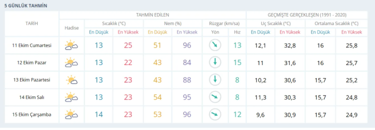 11-13 Ekim tarihleri arasındaki hava durumu verilerine göre, cumartesi günü sıcaklık 25 dereceye kadar çıkarken, pazar günü termometrelerin 22 dereceyi göstermesi bekleniyor.