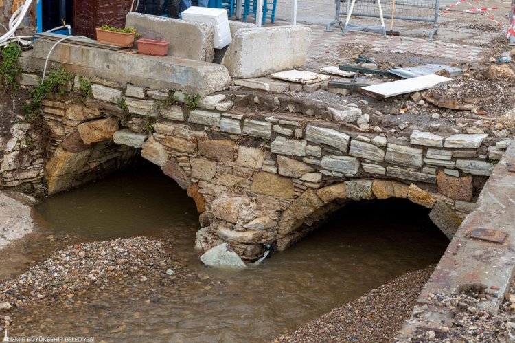 İZSU’nun Yeni Foça’da Şavklı Deresi çıkışında tarihi köprüyü koruyarak yaptığı genişletme ve alternatif menfez çalışması, yağışın yarattığı sorunları engelledi.