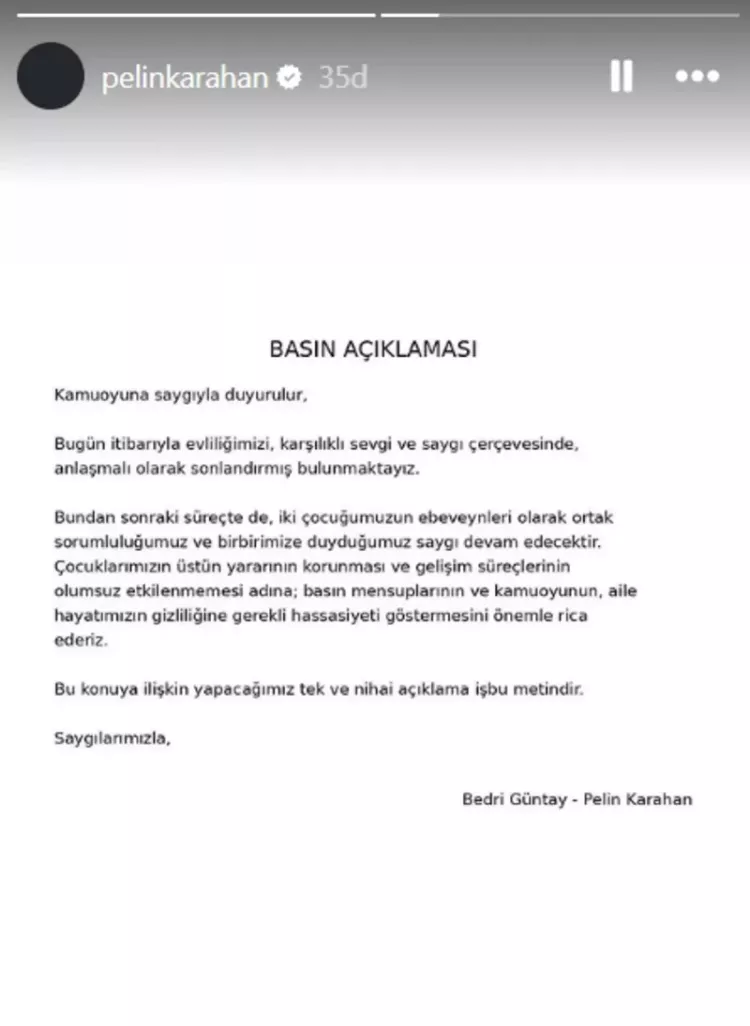 Boşanma kararının ardından Karahan ve Güntay, kamuoyuyla paylaştıkları ortak açıklamada ayrılığın karşılıklı anlayış çerçevesinde gerçekleştiğini belirtti. Açıklamada, "Çocuklarımızın bakım ve gelişim süreçleri önceliğimiz olmaya devam edecek" ifadelerine yer verildi.