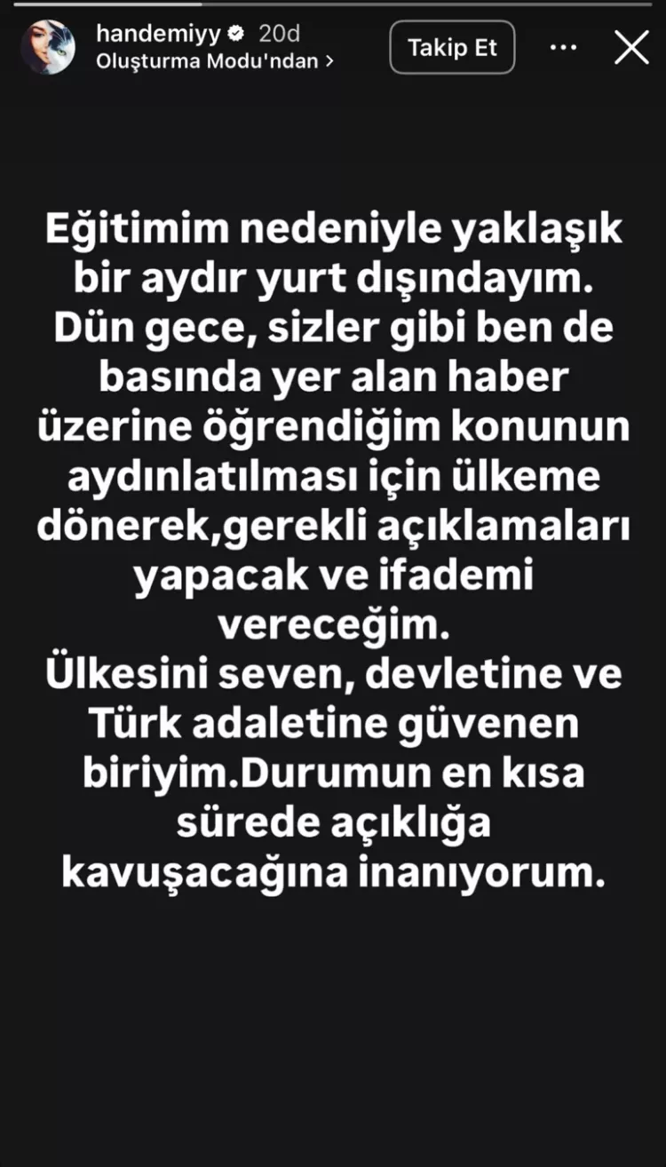 YAKALAMA KARARI ÇIKAN HANDE ERÇEL’DEN AÇIKLAMA
