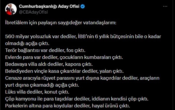 İmamoğlu, "560 milyar yolsuzluk var dediler, İBB’nin 6 yıllık bütçesinin bile o kadar olmadığı açığa çıktı. Terör bağlantısı var dediler, fos çıktı. Evlerde para var dediler, çocukların kumbaraları çıktı. Bedavaya villa aldı dediler, kapora çıktı. Belediyeden vinçle kasa çıkardılar dediler, yalan çıktı. Cenaze aracıyla rüşvet parasını yurt dışına kaçırdılar dediler, araçların yurt dışına çıkamadığı açığa çıktı. Lüks villa dediler, konut çıktı. Çöp kamyonu ile para taşıdılar dediler, iddianın kendisi çöp çıktı. Parkelerin altına para koydular dediler, hayal ürünü çıktı. 1200 telefon dağıttılar dediler, yalan çıktı. Kiptaş’tan daire dağıttılar dediler, yine yalan çıktı. Lüks araçlar garajda dediler, arabalar başkasının çıktı. Şirkete ihale yağdırıldı dediler, hiç ihale almadığı açığa çıktı. Sağlam delil var dediler, hayal mahsülü tanıklar çıktı. Ciddi belgeler var dediler “..duymuştum” “sanırım” çıktı. MASAK raporu var dediler, 5 günde uyduruk rapor hazırlattıkları açığa çıktı. Ciddi rapor var dediler, raporu imzalayacak uzman bulamadıkları ortaya çıktı. Büyük yağma var dediler, kendi dönemlerindeki işler çıktı. Aynı kurumda çalışan kişilere neden birbirinizle görüşüyorsunuz dediler, güzel bir komedi çıktı. Veriler çalınıyor dediler, kuyruklu yalan çıktı. İBB Berkay Gezgin’e para yolladı dediler, yalan çıktı. Hepsi zenginleşti dediler, mal varlıklarında artış olmadığı ortaya çıktı. Valizlerde para taşınıyor dediler, sinyal kesiciler çıktı. Şikayet edenler CHP’li dediler, hepsi kendi adamları çıktı. Müdür bizi tehdit etti dediler, tam tersi çıktı. Kamuyu zarara uğrattılar dediler, yine tam tersi çıktı.