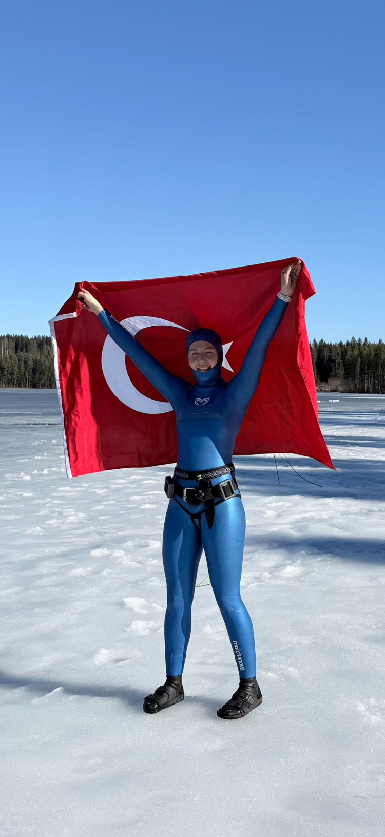 Dalışın ardından buz üzerinde Türk bayrağını açan milli sporcu, elde ettiği başarıyla Türkiye’ye bir kez daha gurur yaşattı.
