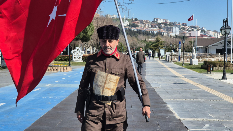 ASKERİ KIYAFETİ VE TÜRK BAYRAĞIYLA ÇANAKKALE'YE YÜRÜYOR