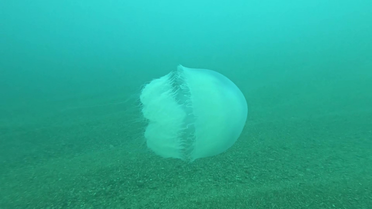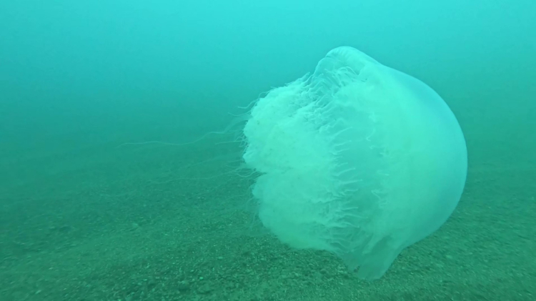 Akdeniz Üniversitesi’nden Prof. Dr. Mehmet Gökoğlu, yaklaşık 10 gündür etkili olan poyraz nedeniyle Akdeniz’in en büyük denizanası türü Rhopilema nomadica’nın Antalya Körfezi’ne sürüklendiğini açıkladı. Düdüklü tencere büyüklüğündeki ve 10 kilograma kadar ulaşabilen dev tür, sualtı kamerasıyla görüntülendi.
