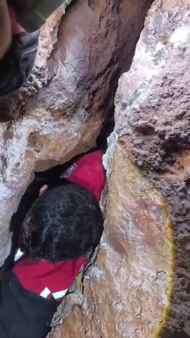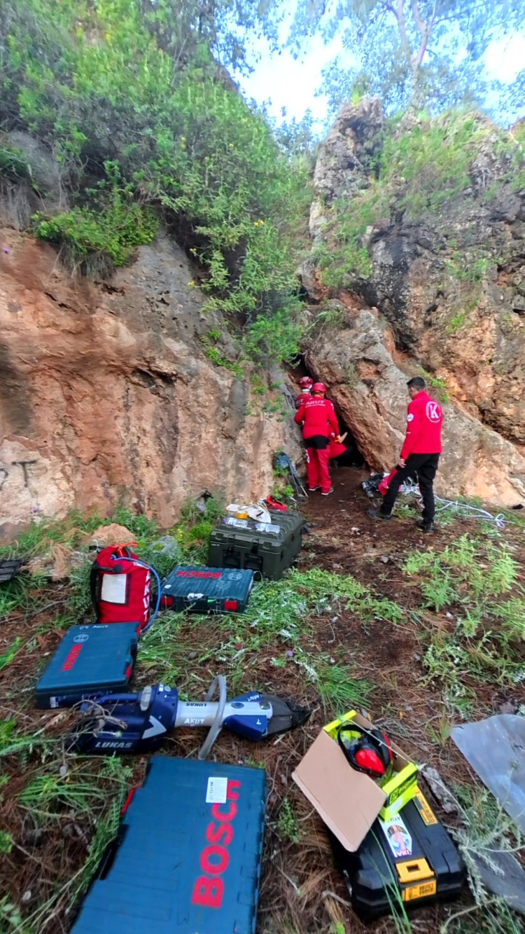 Yaklaşık 120 kilometre yol kat ederek bölgeye ulaşan ekipler, güvenlik önlemlerinin ardından kurtarma çalışması başlattı. İlk olarak yarığın dar olan girişi hilti yardımıyla genişletildi.