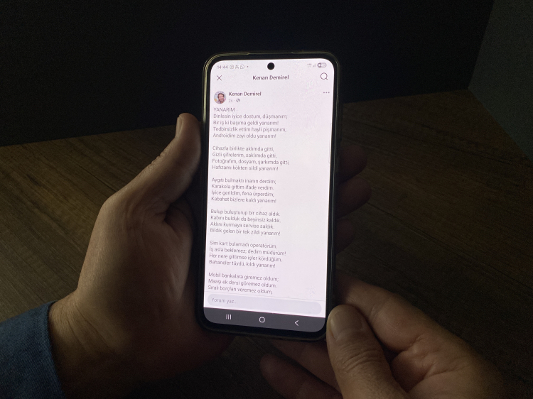Kenan Demirel’in kaybolan telefonuyla birlikte yaşadığı maddi ve manevi zorluklar, kaleme aldığı dizelere ilham verdi. Telefonunu şarja taktığı bir odada unutan Demirel, geri döndüğünde cihazının yerinde olmadığını fark etti. Durumu polis ekiplerine bildiren Demirel, yaşadığı kaybın ardından duyduğu sıkıntıyı şu sözlerle dile getirdi: