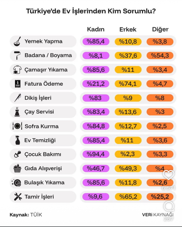 Türkiye İstatistik Kurumu’nun (TÜİK) verilerine göre, ev işlerinin büyük kısmı kadınların sorumluluğunda yer alıyor.
